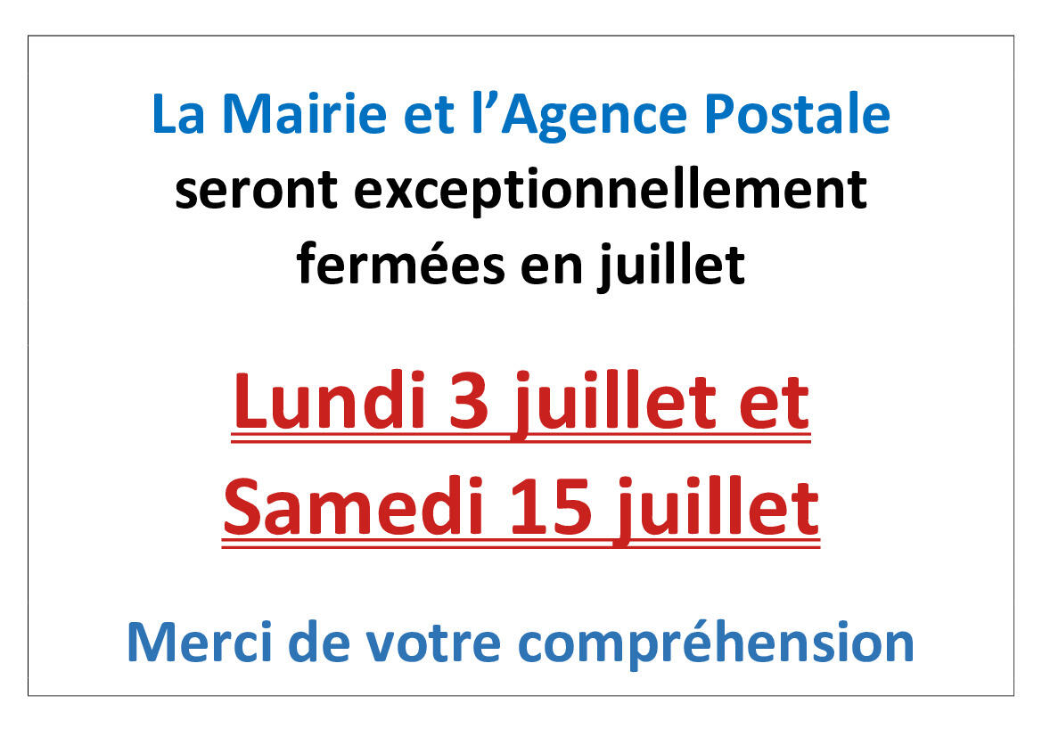 Fermeture exceptionnelle de la Mairie et de la Poste lundi 3 juillet et samedi 15 juillet