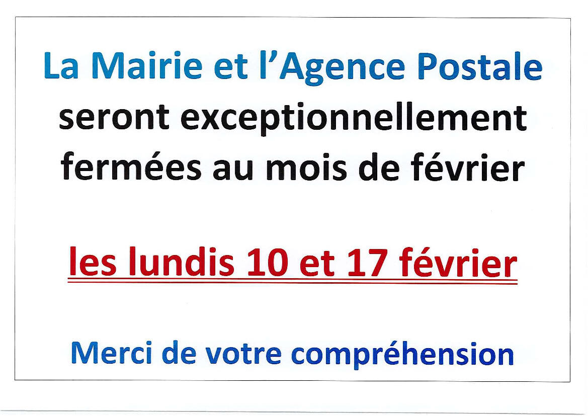 Fermeture exceptionnelle de la Mairie et de la Poste lundi 10 et lundi 17 février