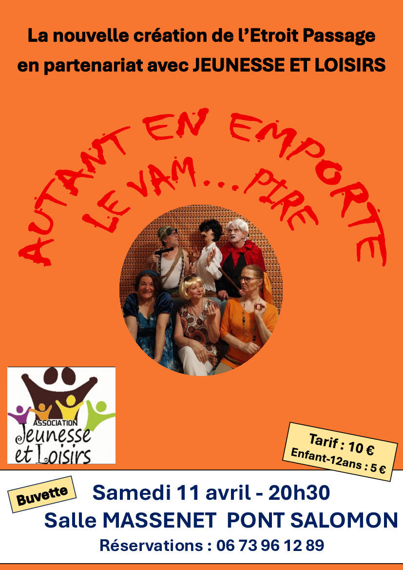 🎭 En partenariat avec l'association Jeunesse et Loisirs, la compagnie L'Étroit Passage jouera sa dernière création le SAMEDI 11 AVRIL À 20H30 "Autant en emporte le Vam...pire", une comédie tout public, "sang pour sang" humour et burlesque.