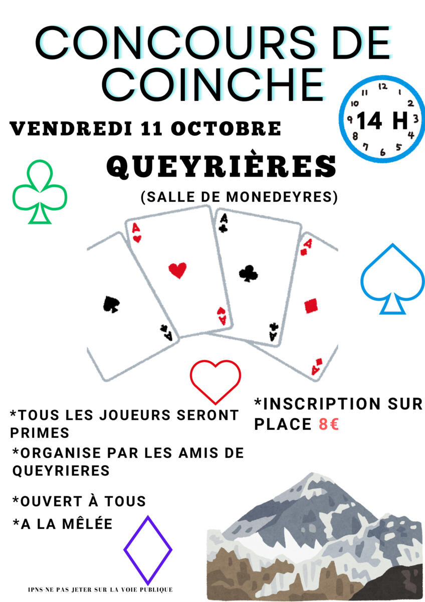 L'association des amis de Queyrières organise le vendredi 11 octobre 2024 un concours de coinche.