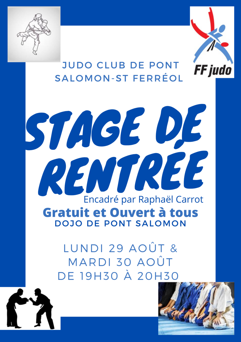 Venez vous remettre en forme avant la reprise avec le stage de rentrée le lundi 29 et le mardi 30 août de 19h30 à 20h30 au dojo de Pont Salomon.