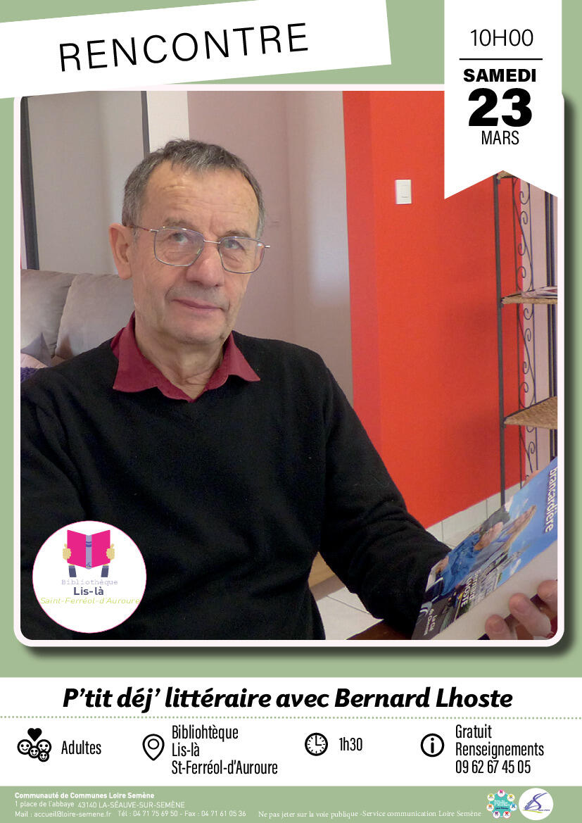 P’tit déj’ littéraire avec Bernard Lhoste 13/3/24 Rencontre avec Bernard Lhoste Samedi 23 mars à 10h Bibliothèque : "Lis-là"
