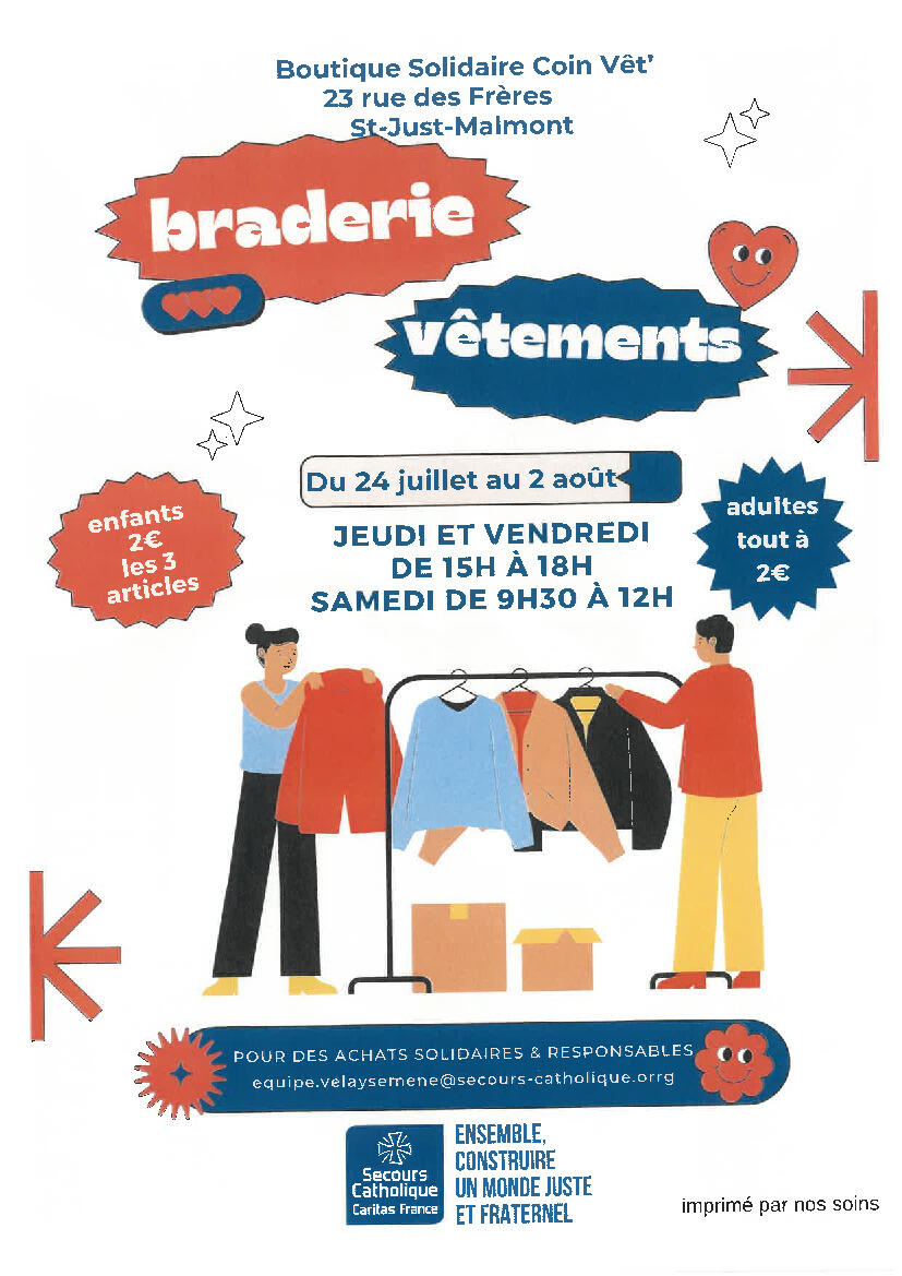 L’équipe “Velay Semène” du Secours Catholique de Saint Just Malmont/Saint Didier en Velay / La Séauve sur Semène / Saint Victor Malescours organise sa Braderie d'Eté à la Boutique Solidaire "Coin Vêt’ " - 23 Rue de Frères, sur deux semaines