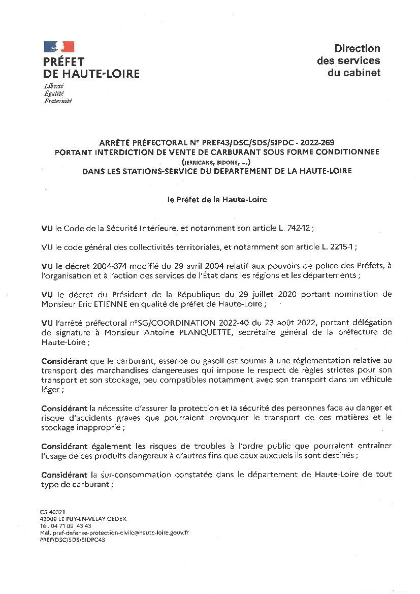 Le préfet de Haute-Loire vous informe que la vente et l'achat de carburants