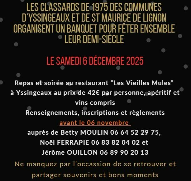 Les classards de 1975 des communes d'yssingeaux et Saint Maurice de Lignon organisent un banquet pour fêter ensemble leur demi siècle le samedi 06 décembre.