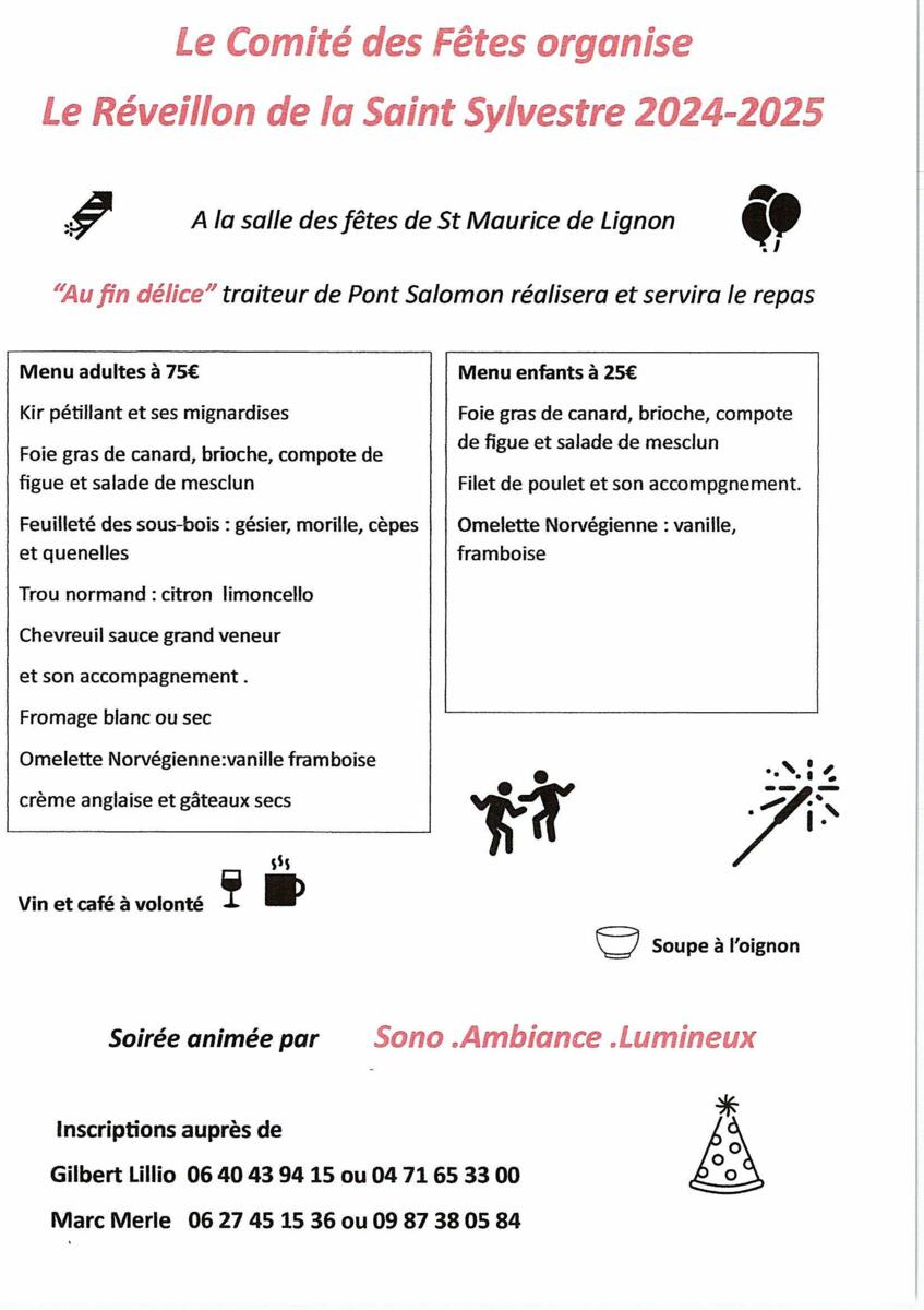 Réveillon 31 décembre 2024 29/11/24 Le comité des Fêtes organise le réveillon de la St Sylvestre 2024