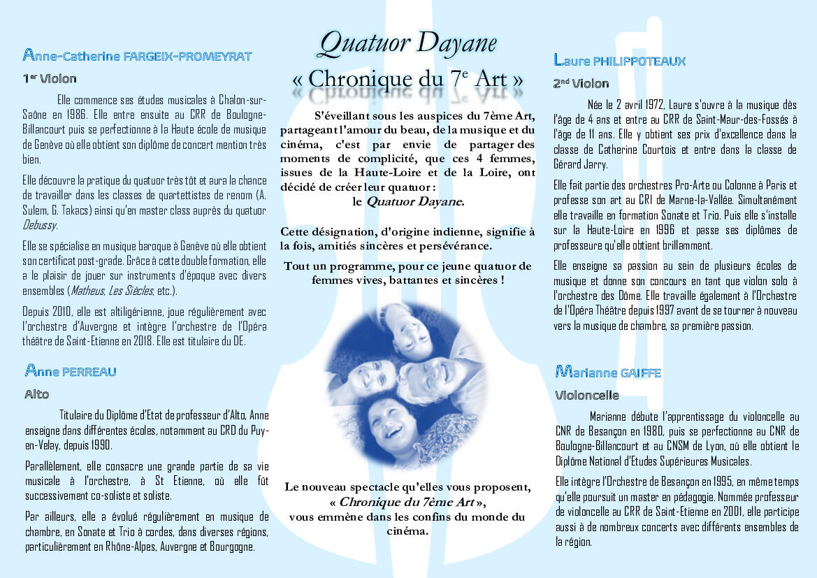 Anne-Catherine FARGEIX-PROMEYRAT (1er violon), Anne PERREAU (Alto), Laure PHILIPPOTEAUX (2nd violon) et Marianne GAIFFE (violoncelle) ont formé ensemble le Quatuor Dayane, qui signifie à la fois amitiés sincères et persévérance.