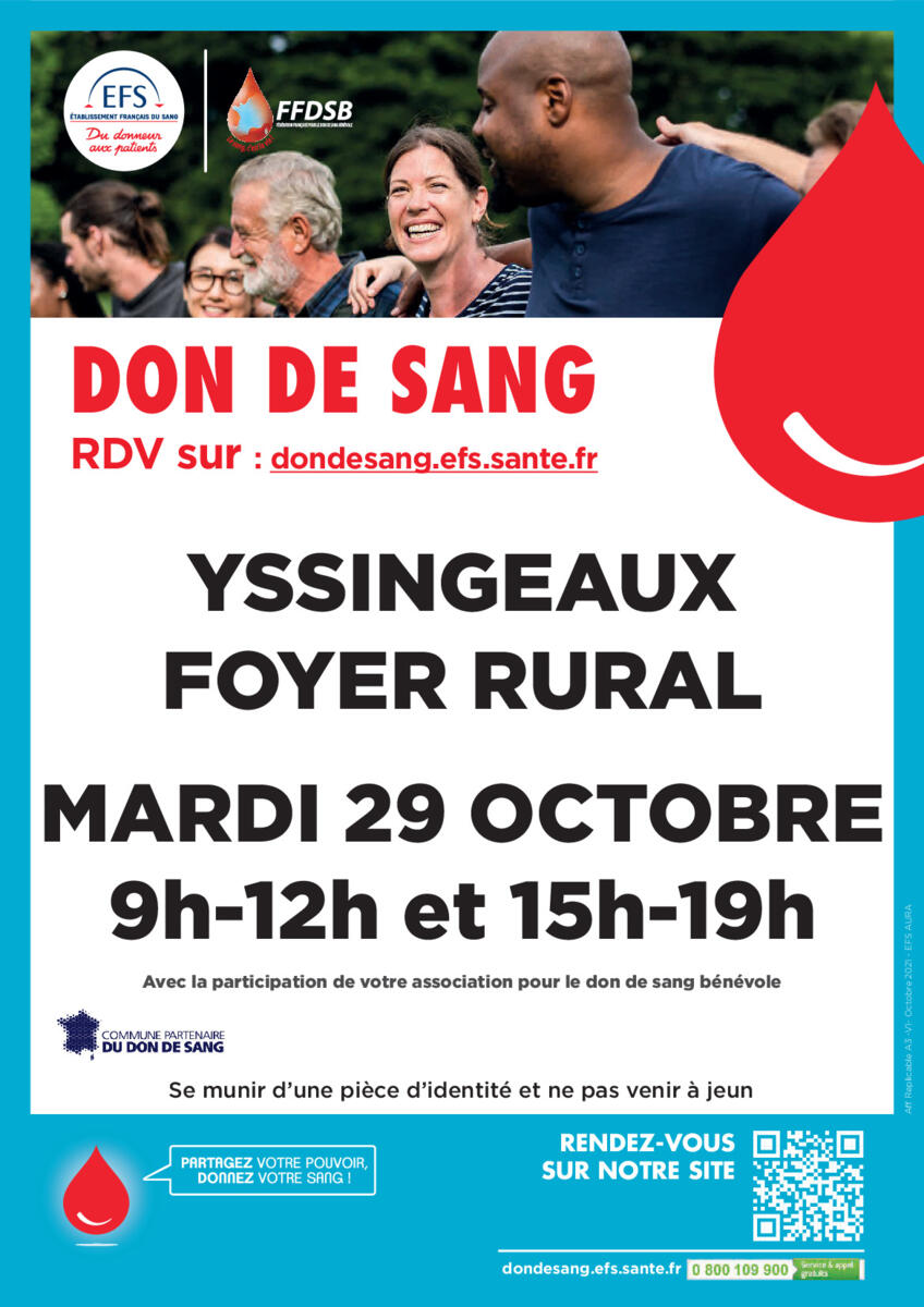 collecte de sang 22/10/24 Collecte de sang Le mardi 29 octobre de 9h à 12h et 15h à 19h Foyer rural à Yssingeaux