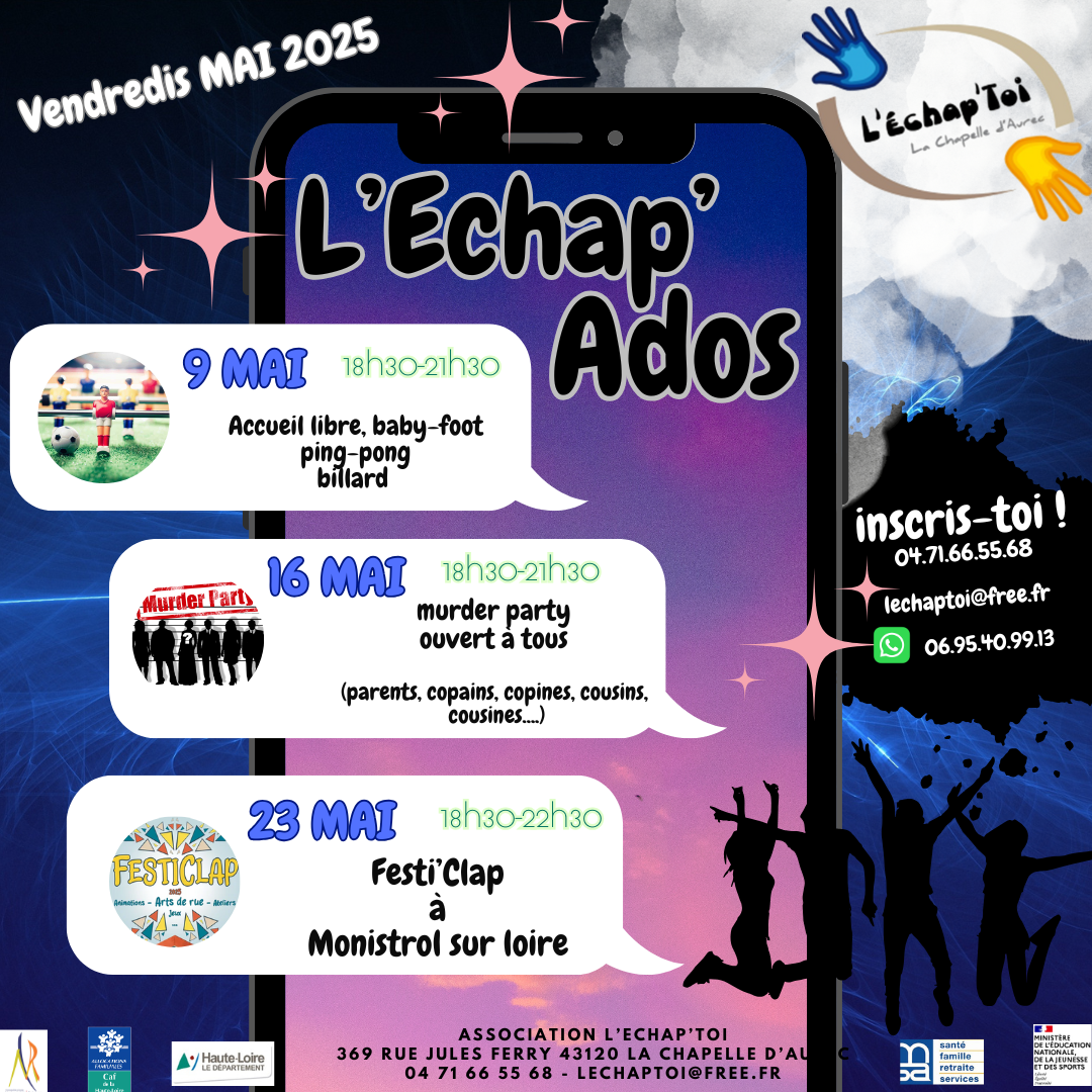 Les vendredis de mai de l'Echap'ados à la Chapelle d'Aurec 14/5/25 retrouvez le programme des vendredis de l'échap'ados du mois de mai