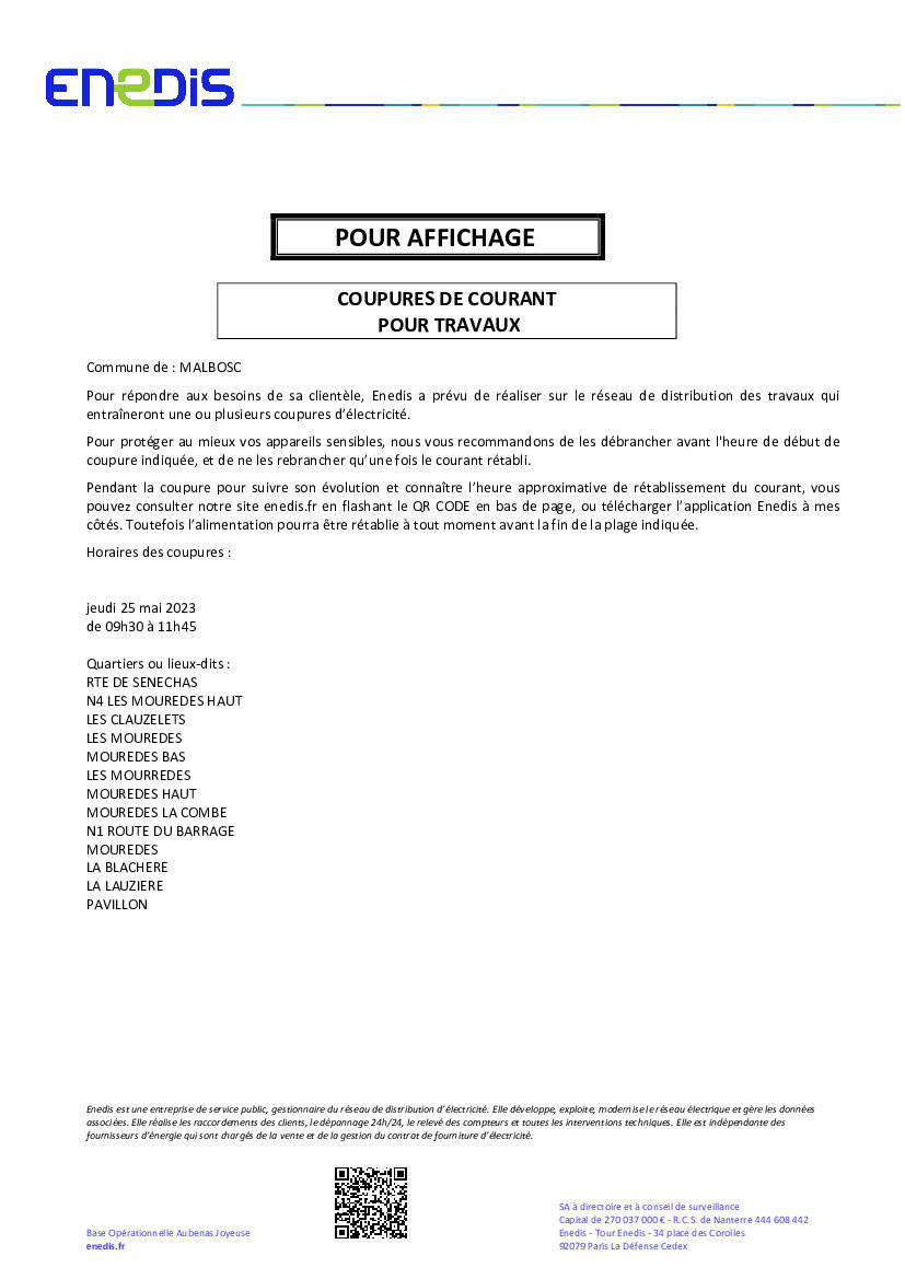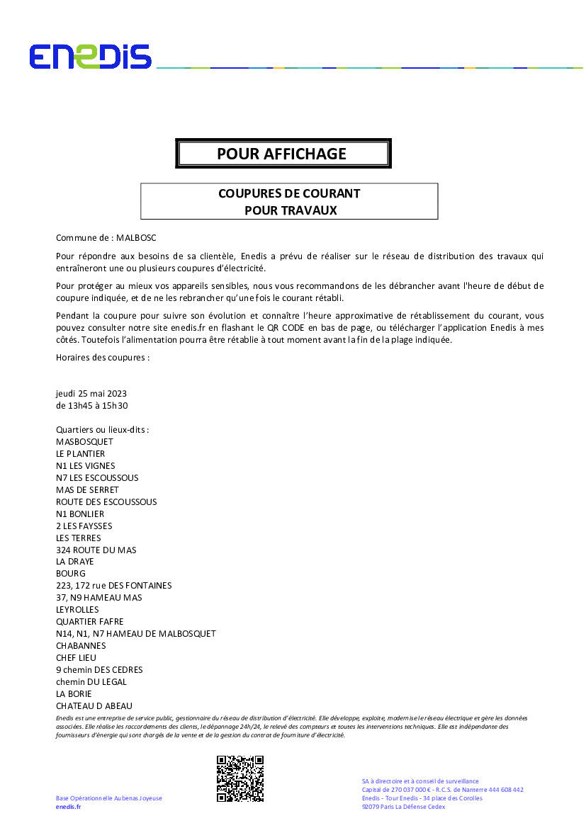 Suite à des travaux sur le réseau électrique qui alimente une partie de la commune, ENEDIS vous informe qu'une coupure d'électricité aura lieu le Jeudi 25 mai de 9h30 à 11h45 OU de 13h30 à 16h00. Veuillez consulter la liste des hameaux pour connaitre quelle plage horaire vous concerne.