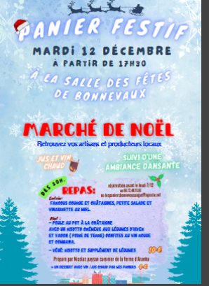 Le marché de Noël des paniers aura lieu le Mardi 12 Décembre, à partir de 17h30 à la salle des fêtes de Bonnevaux avec les producteurs et artisans locaux: gourmandises, cosmétiques, poterie, couture, décorations végétales et cartes postales...