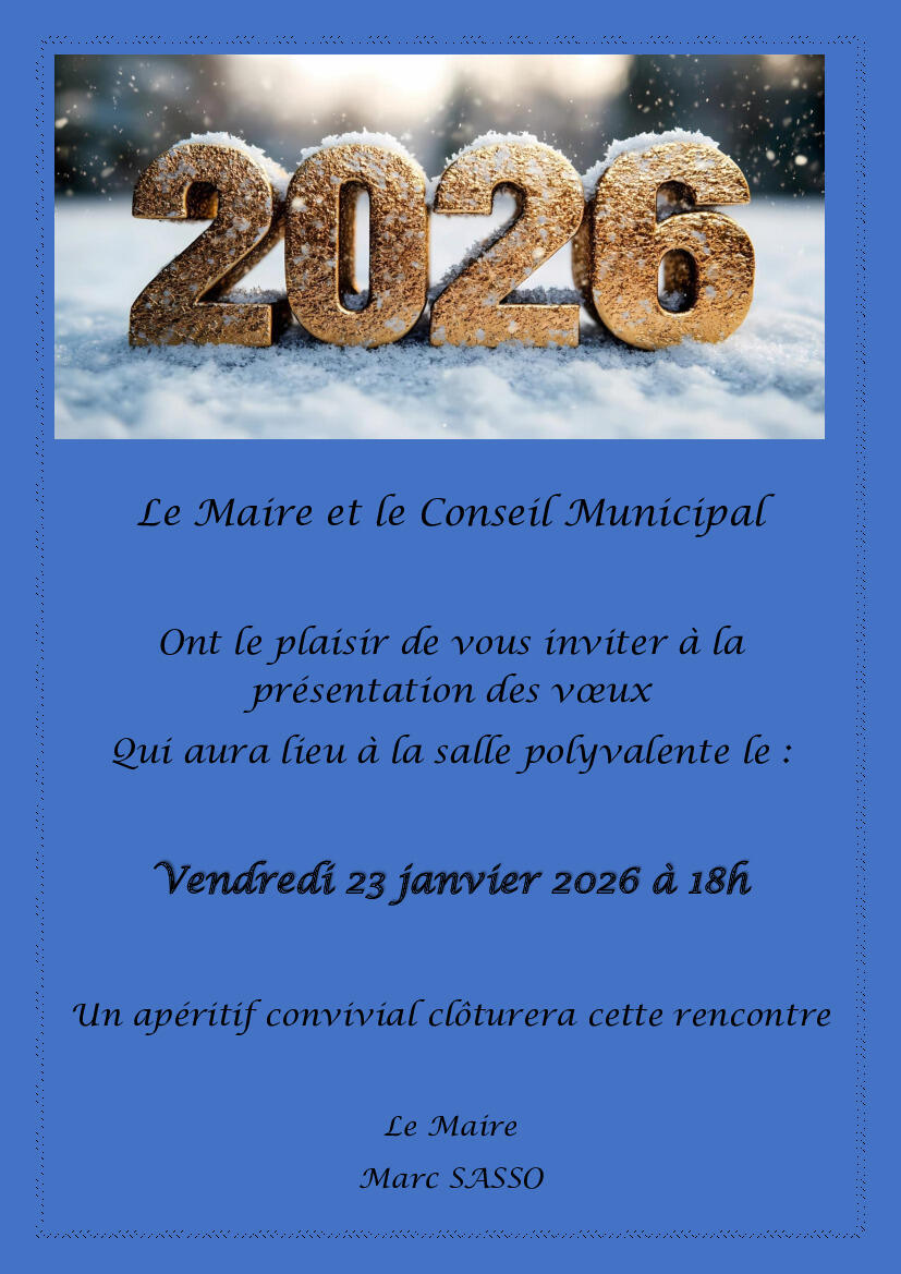 Monsieur le Maire et son Conseil Municipal vous convient à la cérémonie des voeux qui aura lieu le vendredi 23 janvier 2026 à 18h à la salle polyvalente
