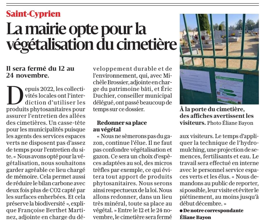 Fermeture temporaire du cimetière à Saint-Cyprien 12/11/2024 Le cimetière sera fermé du 12 au 24 novembre "pour cause" de végétalisation des allées.