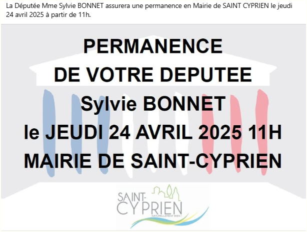 Permanence à Saint-Cyprien de notre députée Sylvie Bonnet 16/04/2025 Permanence en mairie de notre députée Sylvie Bonnet le 24 avril - 11h