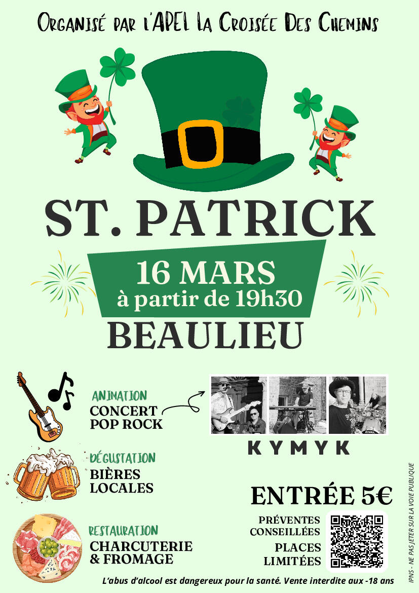 ☘ Fête de la Saint-Patrick 07/03/2024 Samedi 16 mars à la salle polyvalente de Beaulieuà partir de 19h30 :