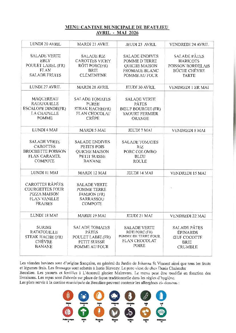 Votre mairie / Actualités / 🍽️MENU CANTINE DU 20/04 au 22/05/2026