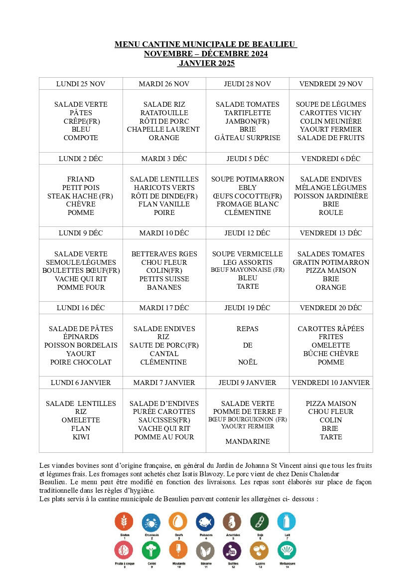 MENU CANTINE DU 25/11/2024 au 10/01/2025