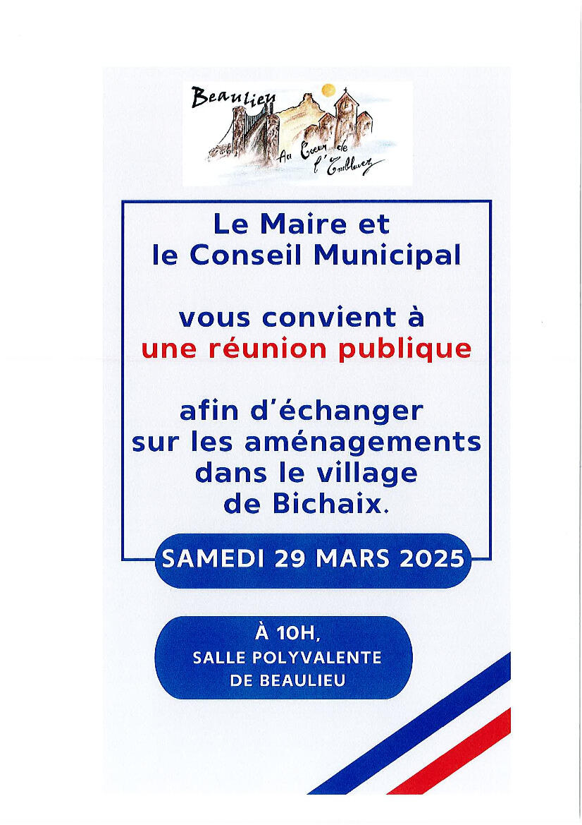 Réunion Publique : aménagements BICHAIX 20/03/2025 SAMEDI 29 MARS 2025 à 10h, à la salle polyvalente.