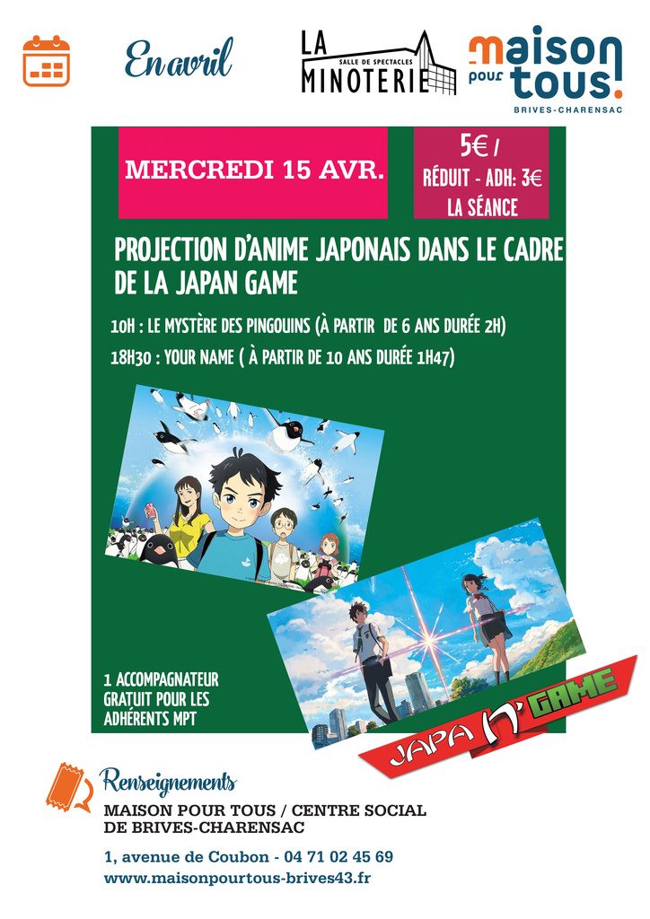 En avant-première de la Japan' Game, profitez d’une journée dédiée au cinéma d’animation japonais à la Maison Pour Tous de Brives-Charensac . 🍿🎌