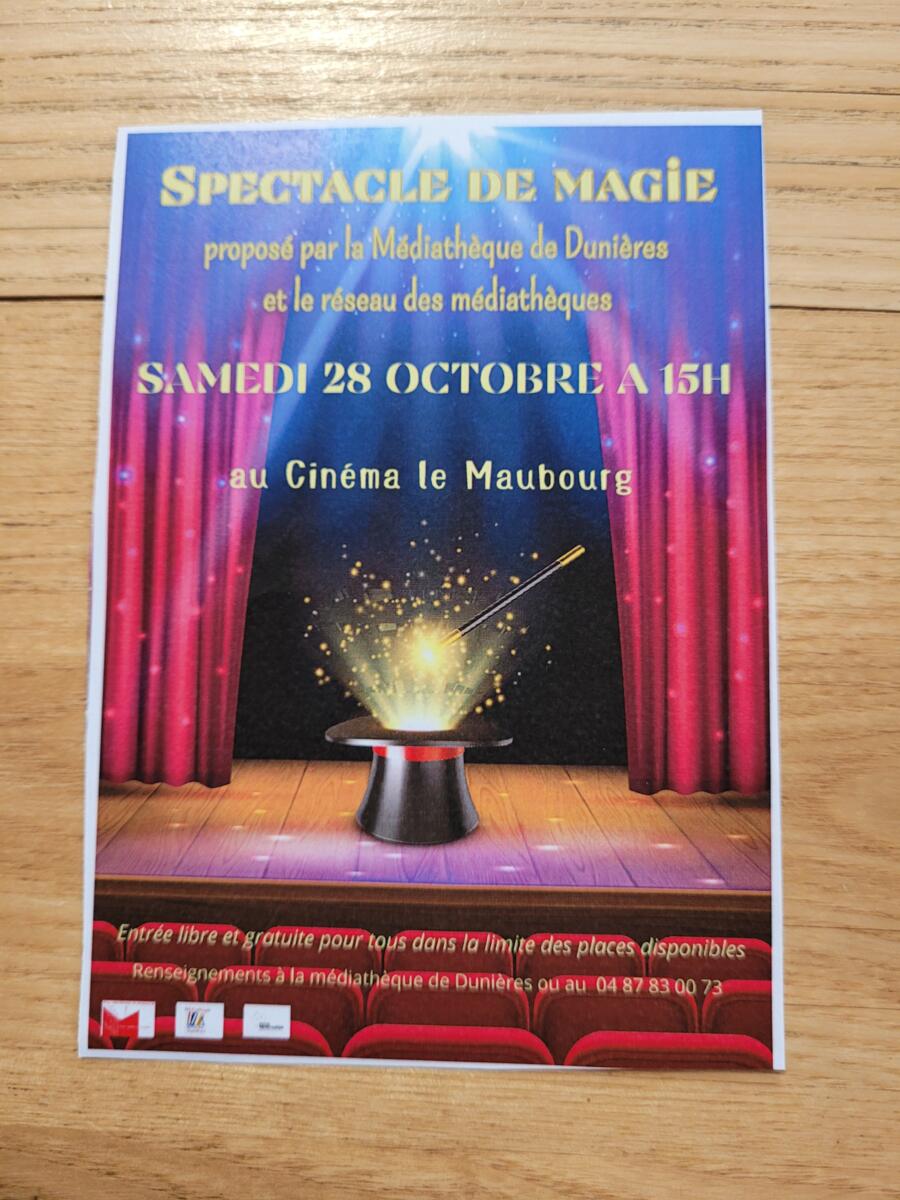 Spectacle de magie 23/10/2023 Samedi 28 octobre à 15h au cinéma le Maubourg spectacle gratuit pour les grands et les petits.