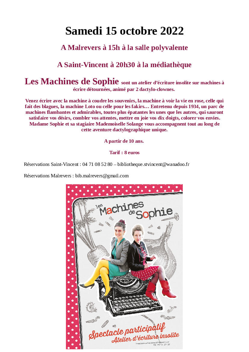 "Les machines de Sophie" à Malrevers samedi 15 octobre
