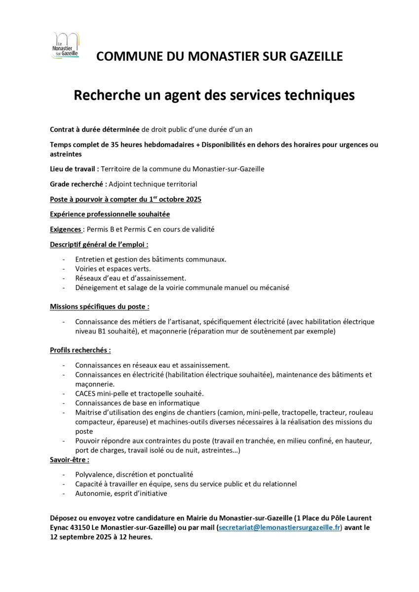 Offre d'emploi - Services techniques du Monastier
