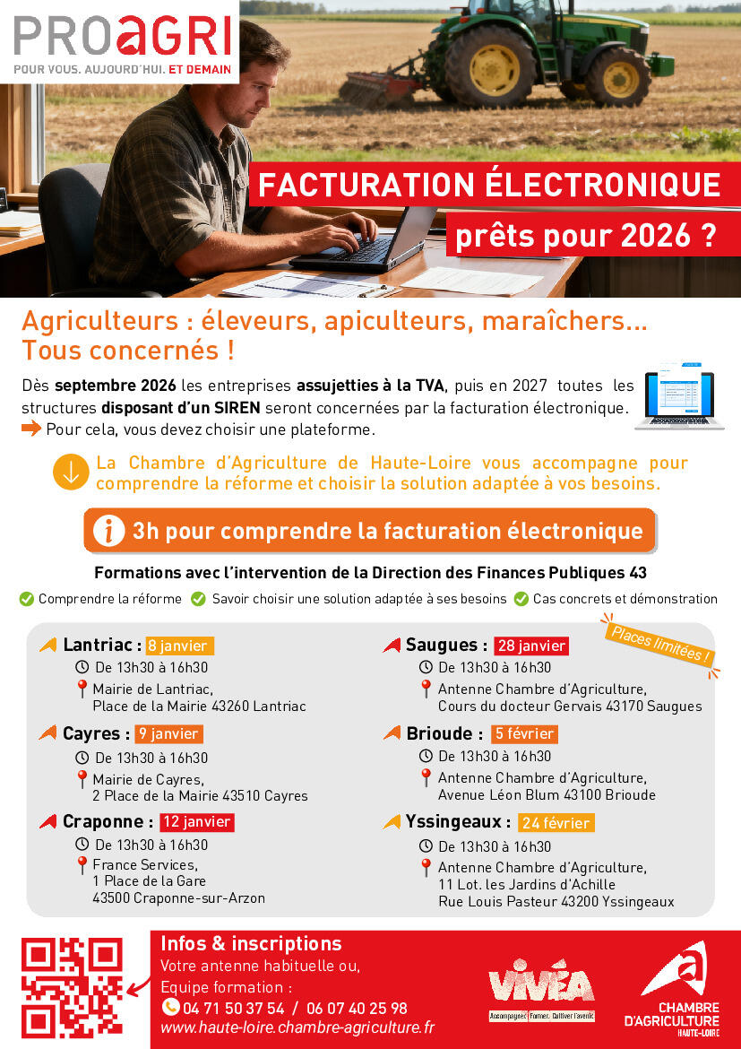 La Chambre d’Agriculture de Haute-Loire organise, avec l’intervention de la Direction des Finances publiques 43, plusieurs formations de 3 heures pour aider les agriculteurs à comprendre la facturation électronique (obligatoire dès septembre 2026 pour les entreprises assujetties à la TVA, puis en 2027 pour toutes les structures disposant d’un SIREN).