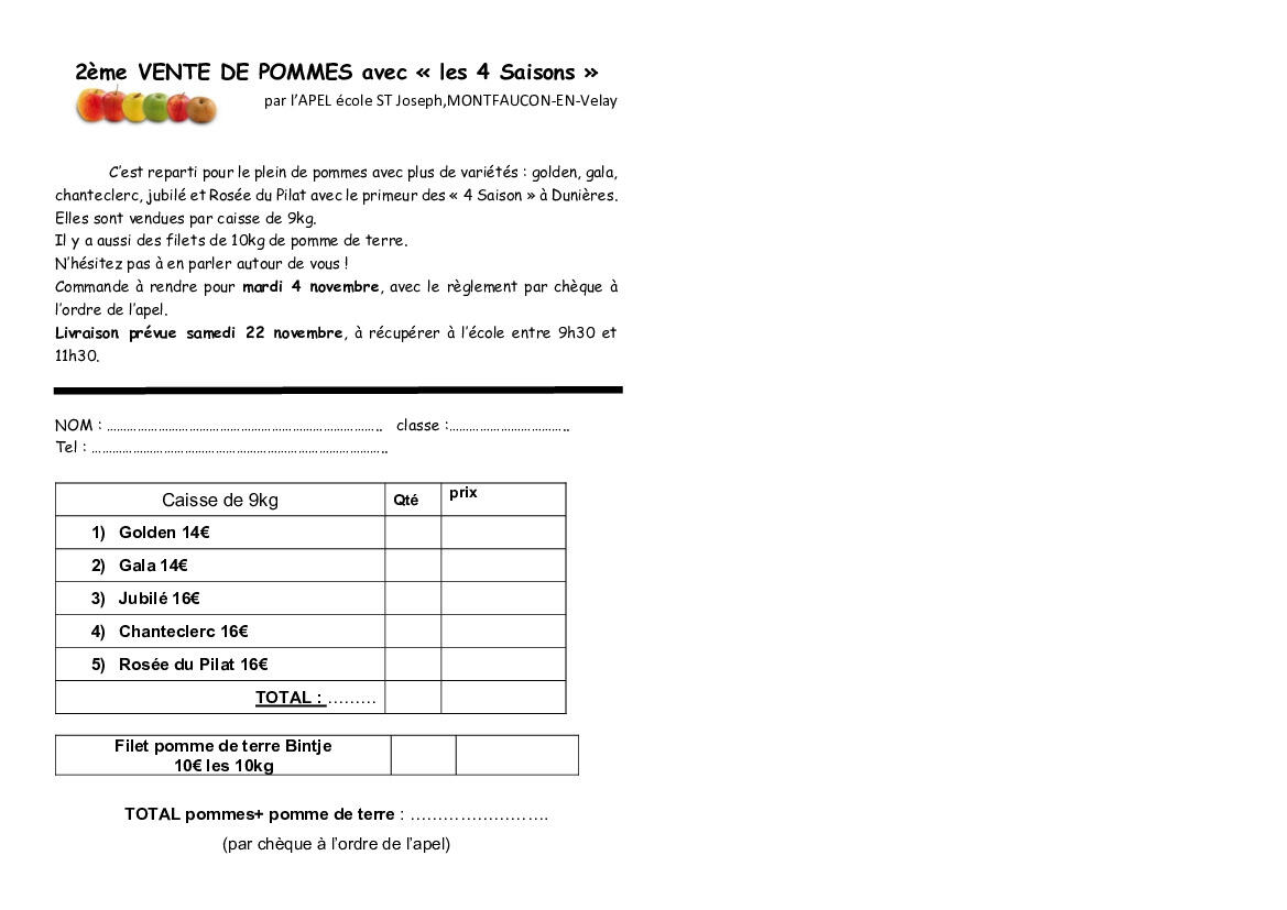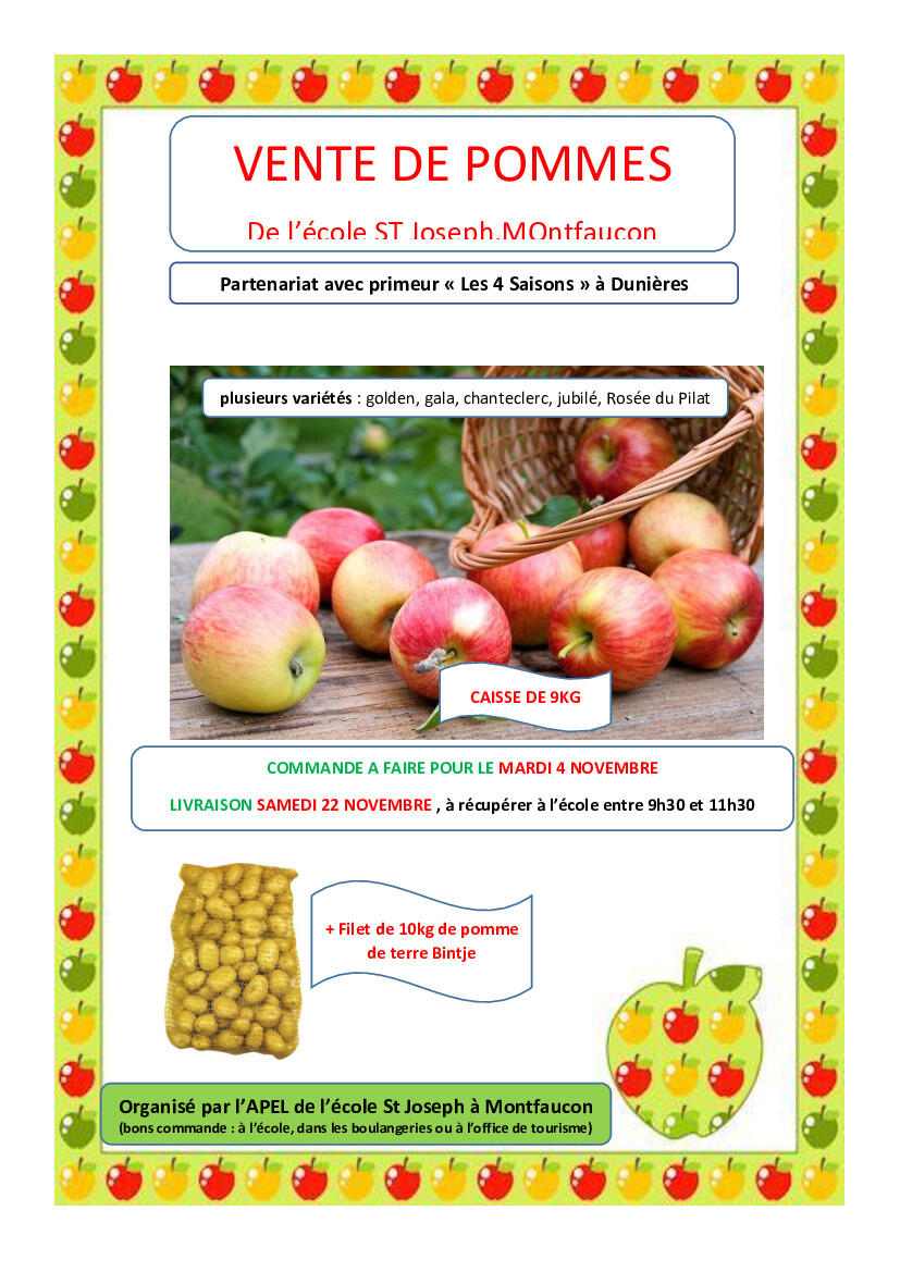 L.APEL de l'école St Joseph en partenariat avec le primeur "les 4 saison" à Dunières propose une vente de pomme de terre accompagnée d'une vente de pommes avec de nouvelles variétés (chanteclerc, jubilé, rosée du pilat mais aussi golden et gala).
