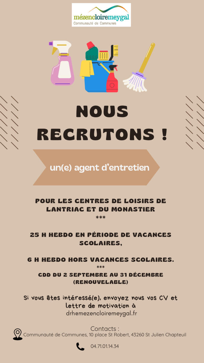 Offre d'emploi 22/08/2024 La Communauté de communes Mézenc Loire Meygal recherche un agent d'entretien. Voir annonce ci-jointe