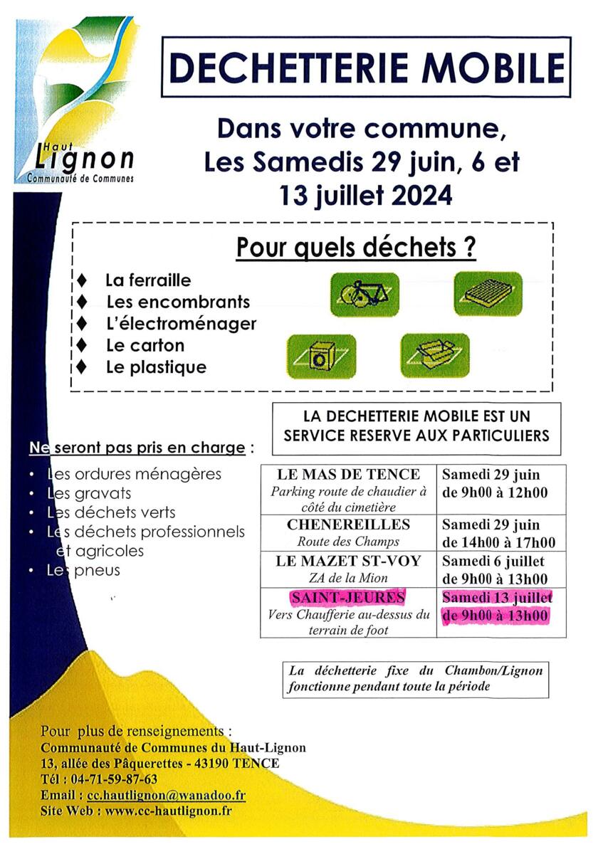 DECHETTERIE MOBILE 25/06/2024 SAINT-JEURESSamedi 13 juillet de 9h à 13h00Vers chaufferie au dessus du terrain de foot