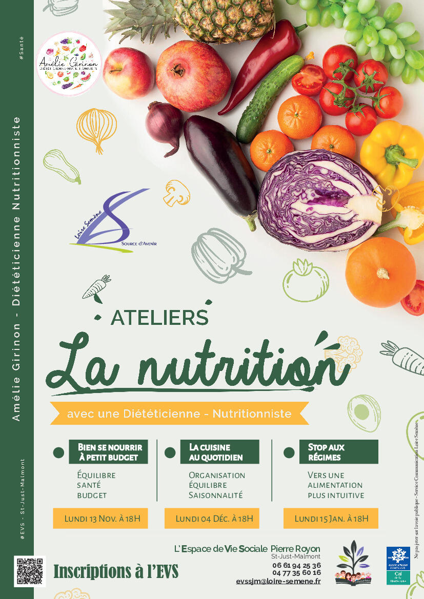 L'Espace de Vie Sociale Pierre Royon organise trois ateliers sur le thème "La Nutrition", animés par Amélie Girinon, diététicienne-nutritionniste :