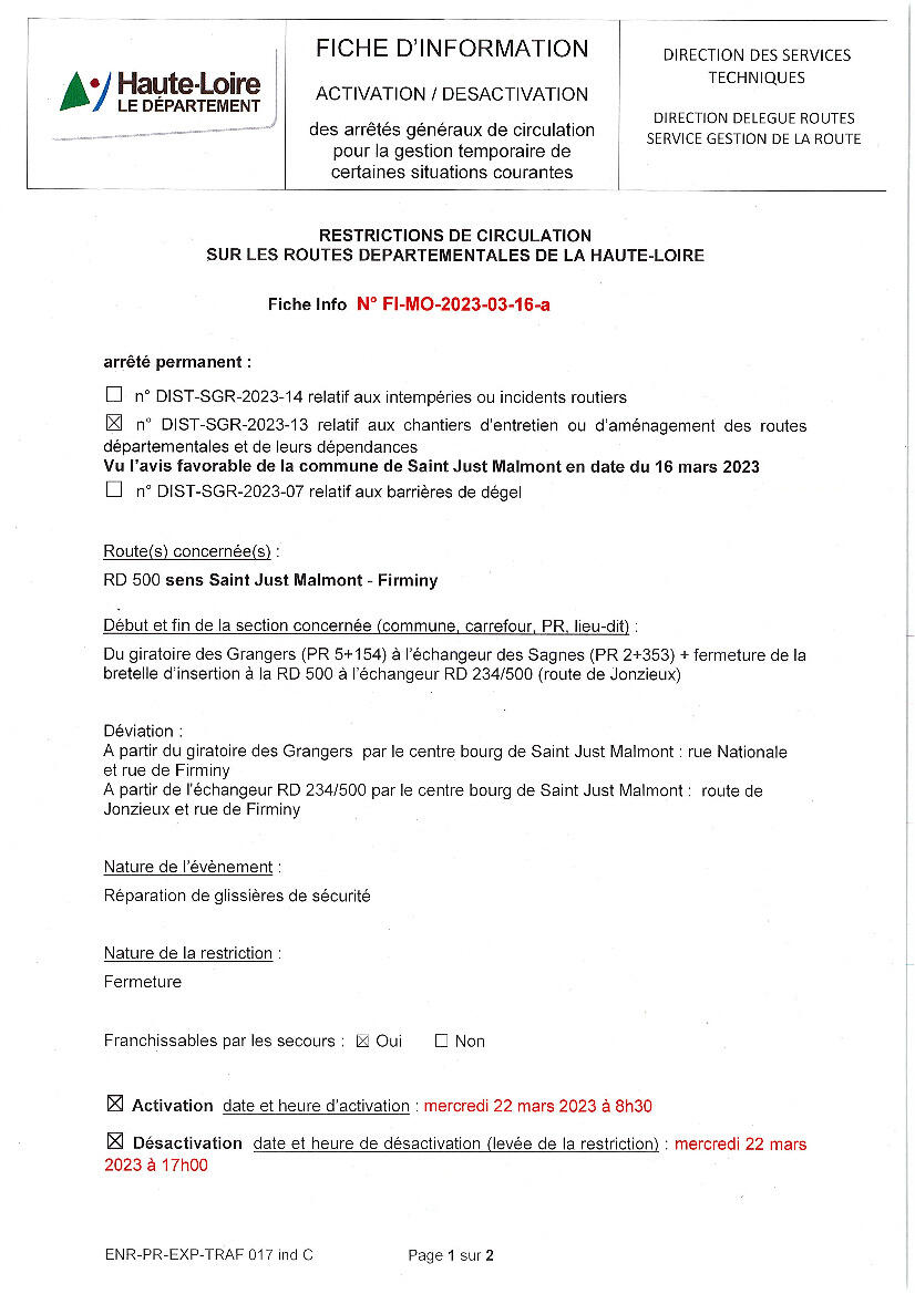 Les véhicules en provenance de Saint Didier en Velay ou de Saint Victor Malescours seront déviés par le centre-bourg de Saint Just Malmont (via Rue Nationale et rue de Firminy).