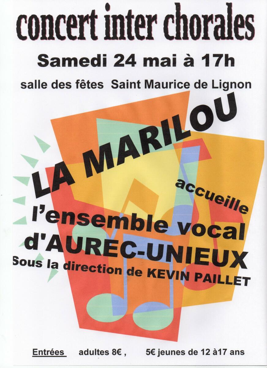 Le samedi 24 mai à 17H à la salle des fêtes de Saint Maurice est invité l'ensemble vocal d'Aurec-Unieux .