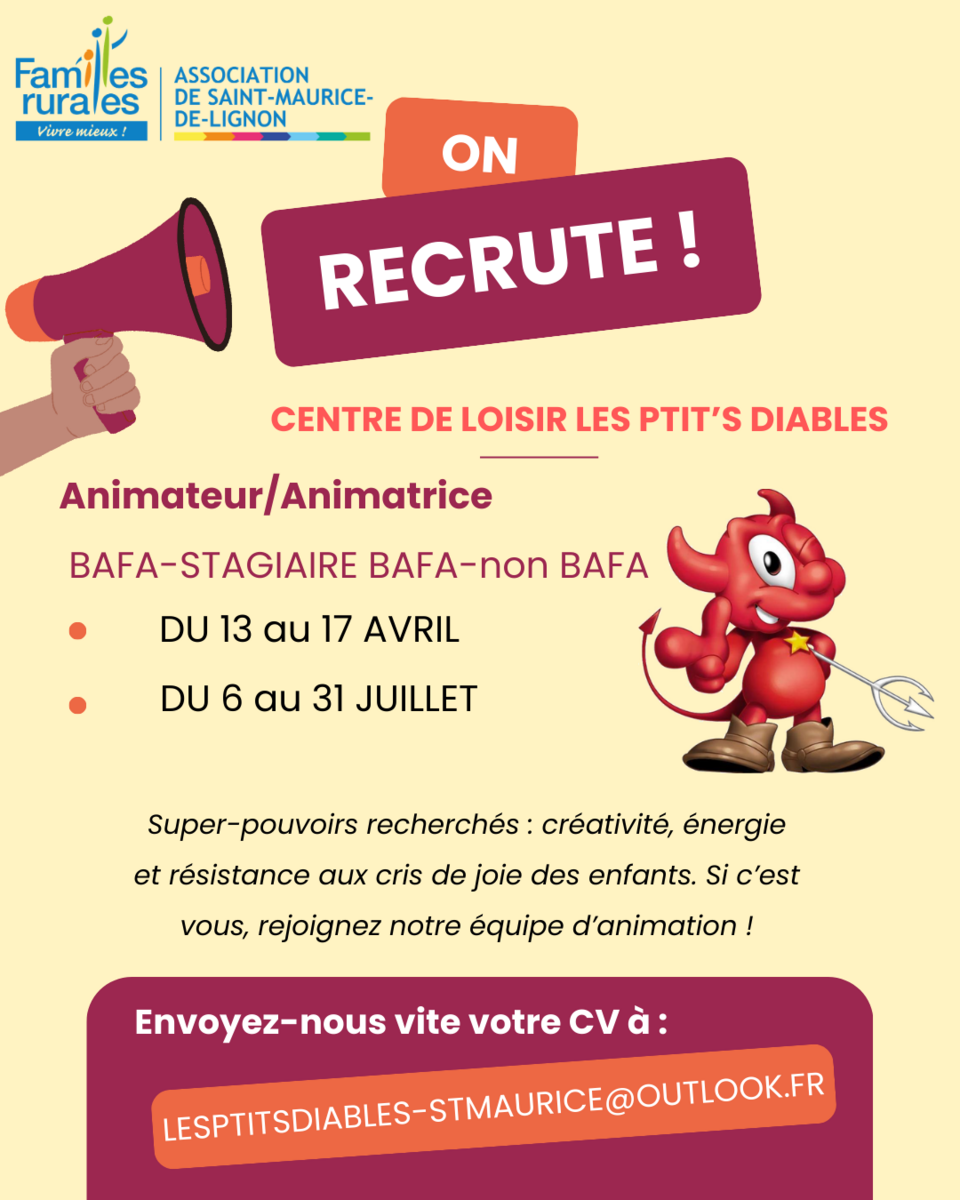 Le centre de loisirs Les Ptit's Diables recherche un ou une animatrice pour les prochaines vacances