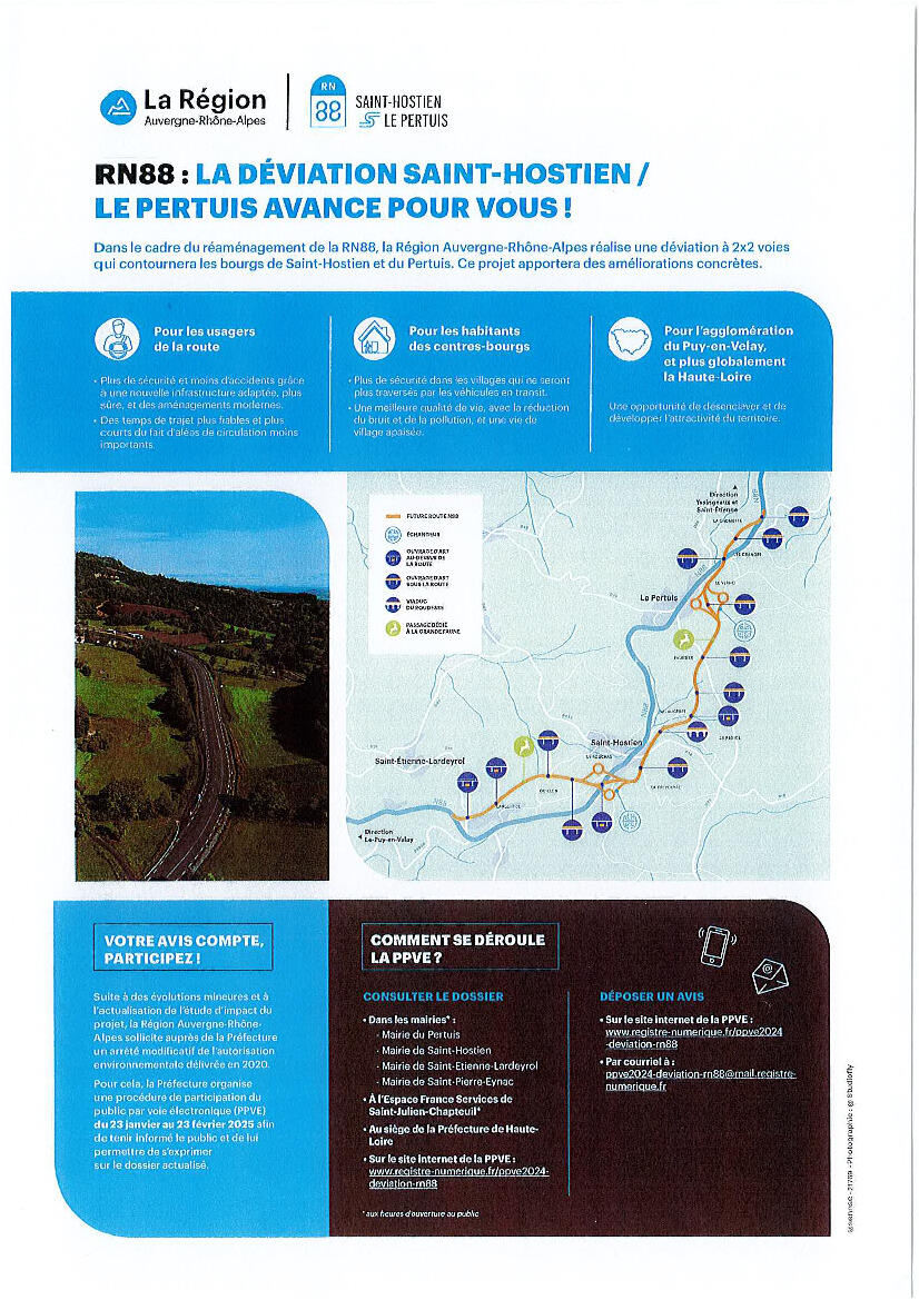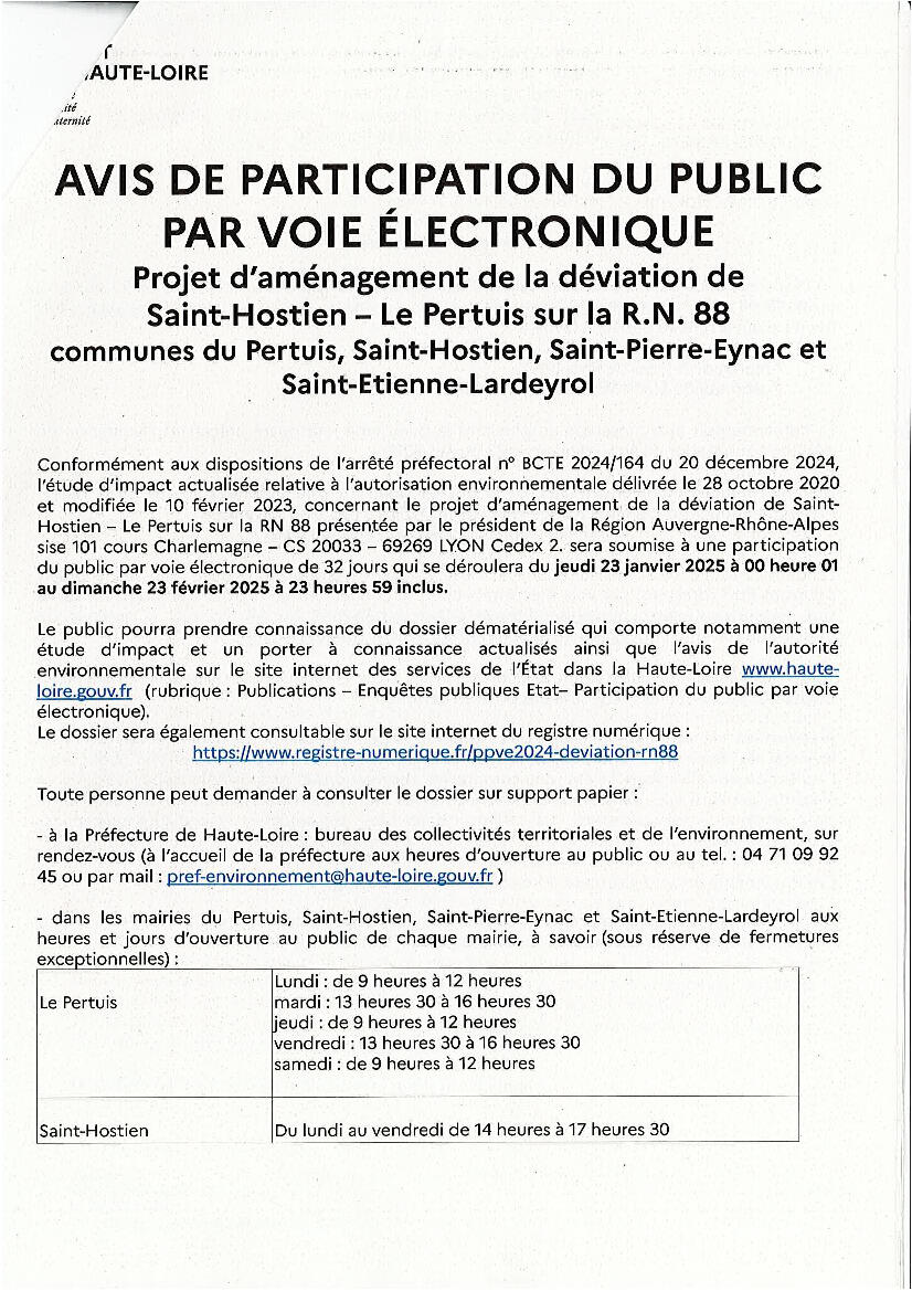 Participation du public par voie électronique (PPVE) concernant le projet d'aménagement de la déviation St Hostien - Le Pertuis sur la RN88