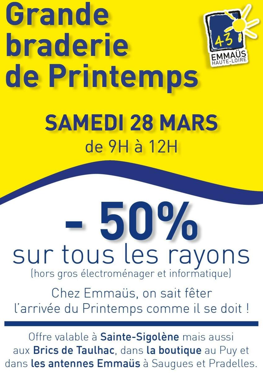 Samedi 28 mars, chez Emmaüs, on sait fêter l’arrivée du printemps comme il se doit : -50% sur tous les rayons (hors électroménager et informatique).