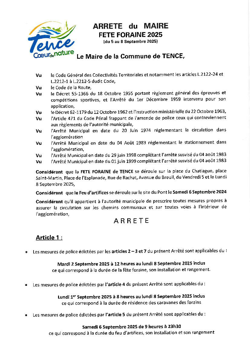 - Les sens de circulation SAINT-AGREVE/SAINT-ETIENNE et ANNONAY/SAINT-ETIENNE/LE PUY-EN-VELAY fixés par Arrêté Municipal du 20 Juin 1974 et qui empruntent la Rue d'Annonay, la Rue de Rachat, la Place du Chatiague et l’avenue du Breuil, seront déviés par la rue des Casernes, la route du Fieu et la rue du Canal. Cette déviation a son origine en face de la Rue des Ecoles (intersection Rue d'Annonay) et son extrémité sur la route Départemental 500 à l’entrée de Tence, vers l’aire de covoiturage.
