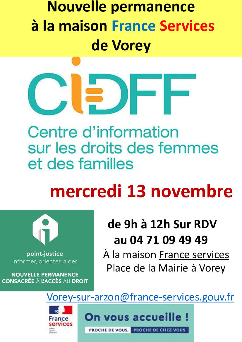 Ainsi que la prochaine permanence le mercredi 13 novembre de 9h à 12h du CIDFF Centres d'information sur les droits des femmes et des familles, ils luttent notamment contre les violences conjugales ...