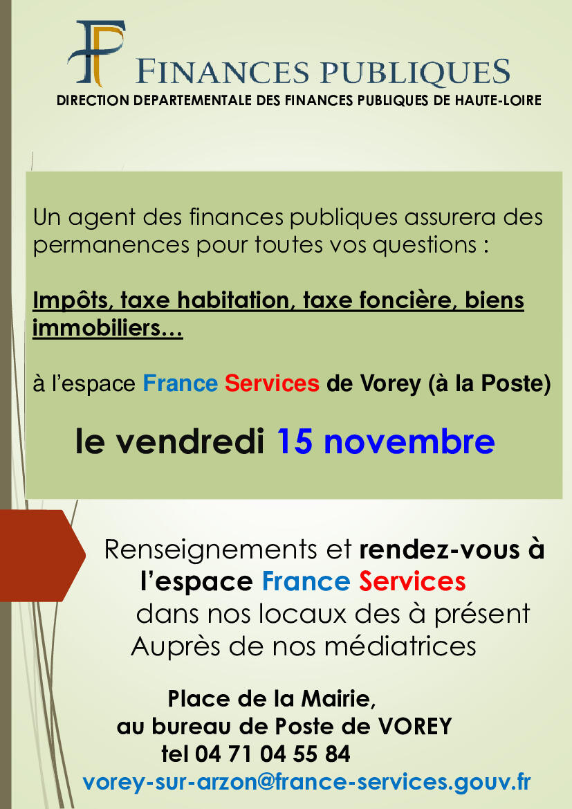 La prochaine permanence des Impôts du 15 novembre à la maison France Services  de Vorey Place de La Mairie à La Poste