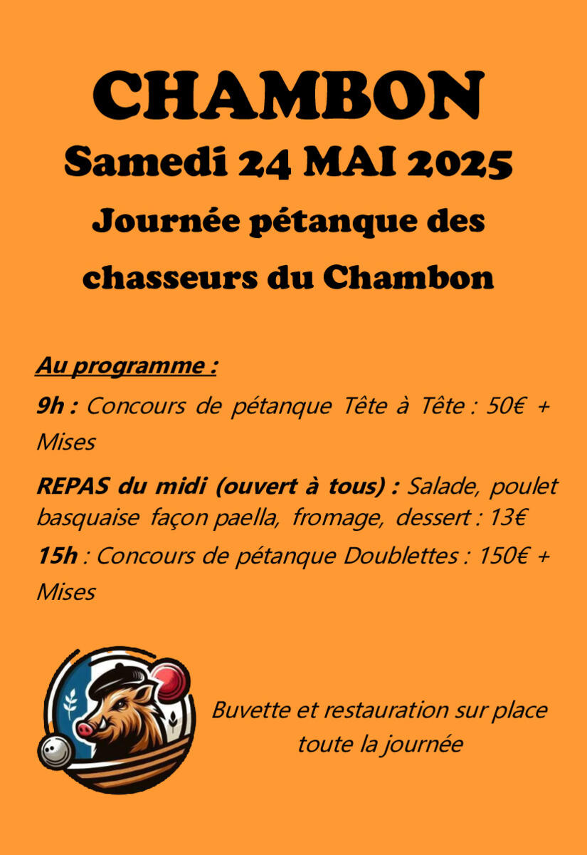 ACCA DU CHAMBON COMMUNIQUE 25-04-25 l'ACCA du CHAMBON organise une journée pétanque le samedi 24 mai 2025