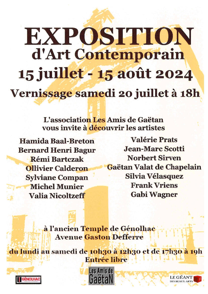 L'association "Les Amis de Gaëtan" vous invite à découvrir divers artistes au temple de Génolhac, avenue Gaston Defferre. Détails sur affiche jointe.