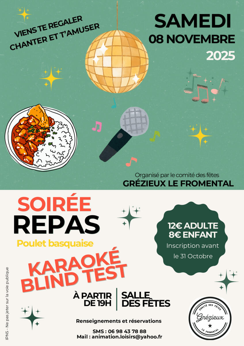 Venez nombreux à la soirée repas karaoké du comité des fêtes à la salle des fêtes de Grézieux
