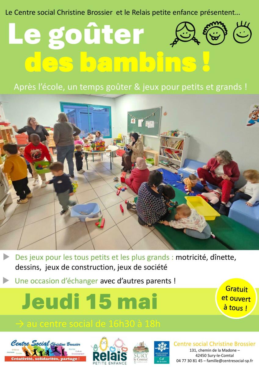 En partenariat avec le Relais petite enfance (RPE) de Sury-le-Comtal, le centre social propose régulièrement des temps de goûter et de jeu juste après la sortie de l’école. Un moment bien appréciable de complicité avec les enfants... et entre parents !