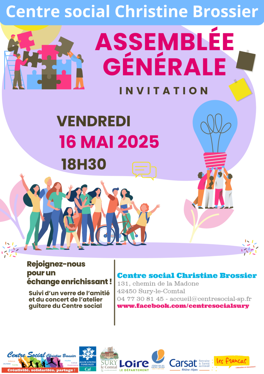 Afin de dresser le bilan de l’année écoulée et d’échanger sur les projets du centre social nous avons le plaisir de vous inviter à l’Assemblée générale annuelle de Surypasserelle, l’association gestionnaire du centre social qui se déroulera le vendredi 16 mai 2025 à 18h30.
