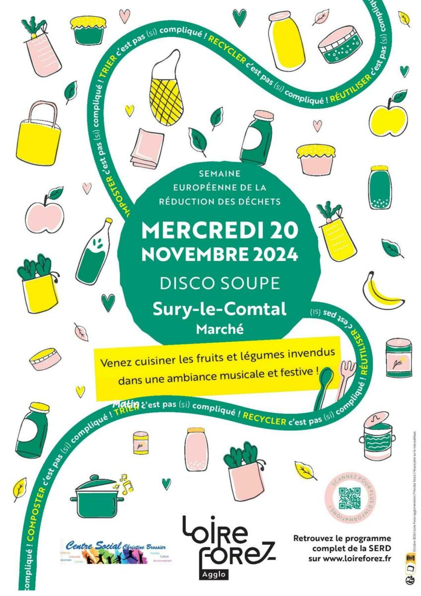 Pendant la matinée, un groupe d’enfants du centre de loisirs, accompagné par la responsable enfance et quelques habitants bénévoles, se rendront au marché de Sury-le-Comtal afin de sensibiliser les passants à la lutte contre le gaspillage alimentaire récupérer les invendus. Ces invendus seront ensuite cuisinés et transformés en soupe devant le centre social. La soupe sera offerte aux familles et aux passants en fin d’après-midi dans une ambiance musicale et conviviale.