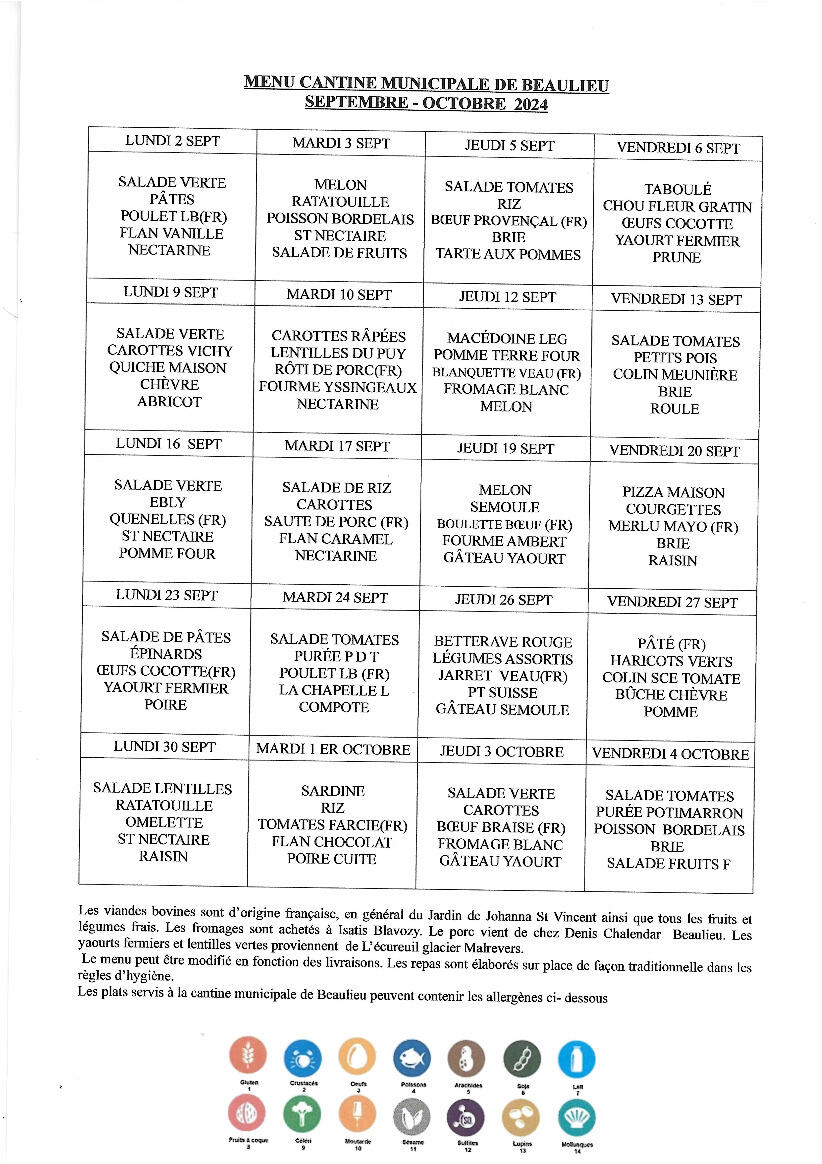 Menu cantine du 2 septembre 2024 au 4 octobre 2024