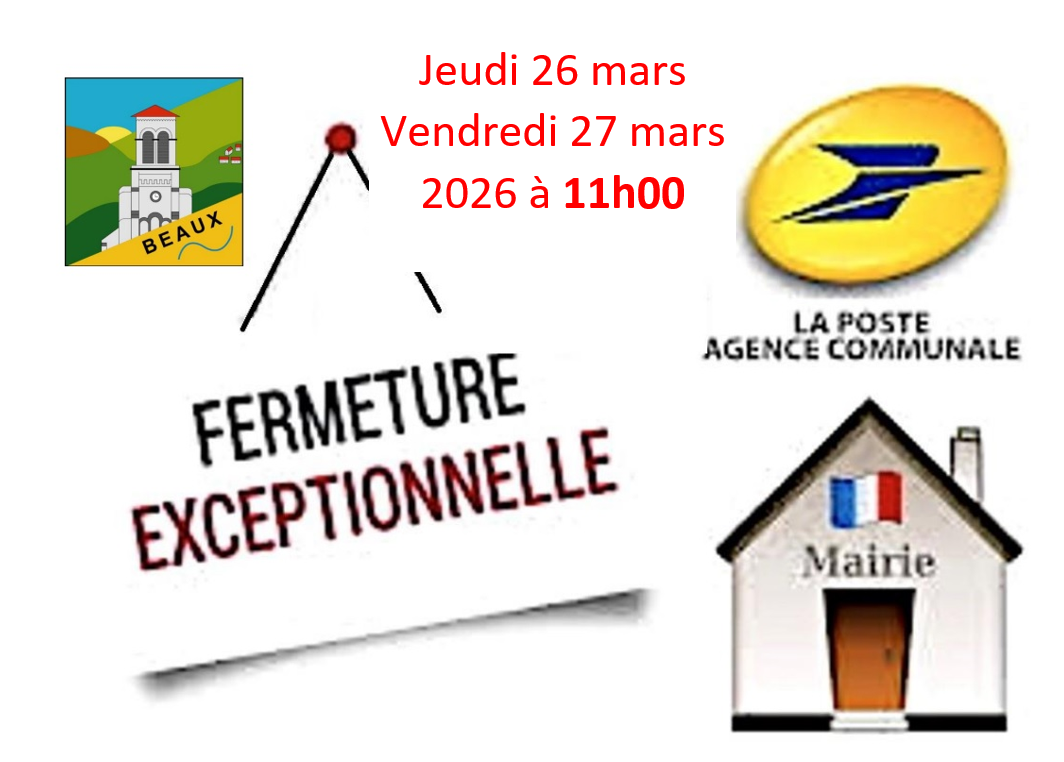 FERMETURE MAIRIE & AGENCE POSTALE 26-03-26 La mairie et la poste seront fermées à partir de 11h jeudi 26 et vendredi 27 mars
