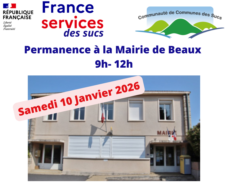 Une permanence aura lieu en mairie de >Beaux le samedi 10 janvier 2026 de 9h00 à 12h00 sur rendez-vous
