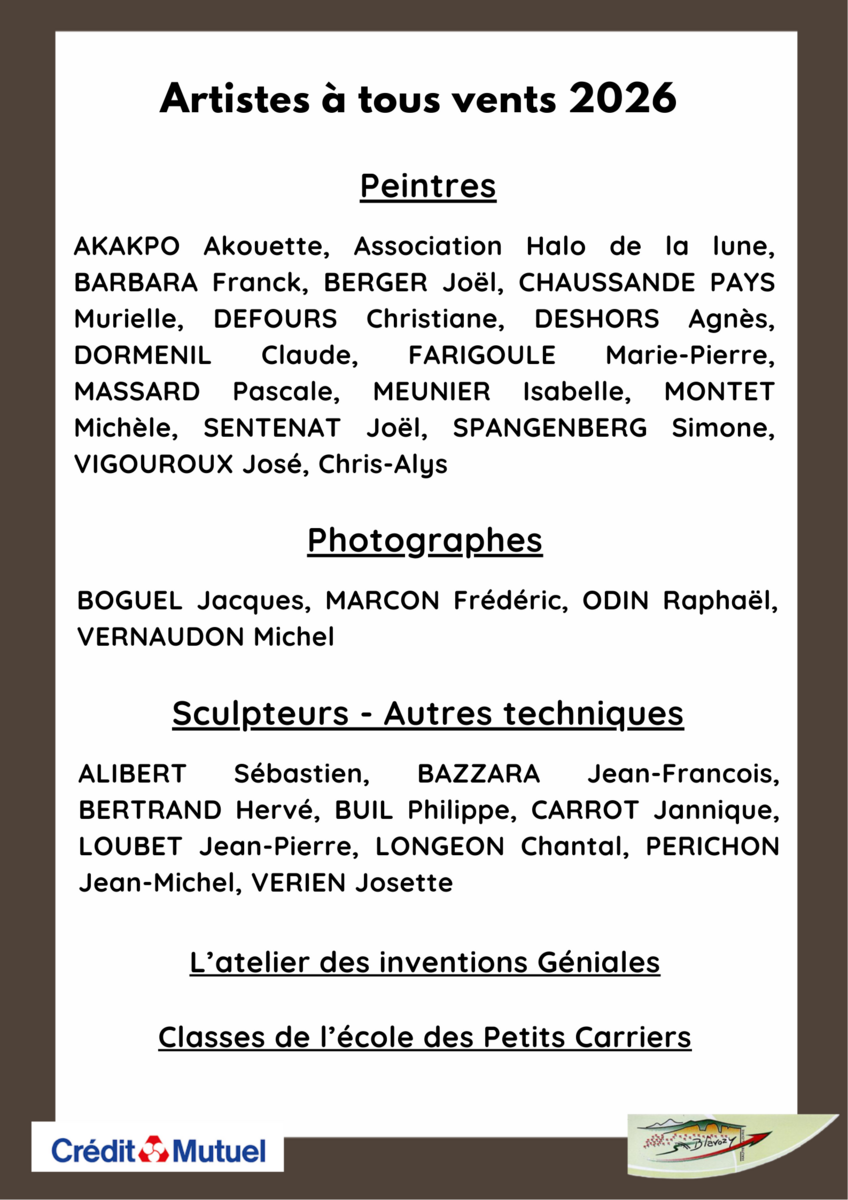 À l'occasion de l'exposition "Artistes à tous vents", plusieurs artistes et créateurs présenteront leurs œuvres au public : peintures, dessins, sculptures et autres expressions artistiques seront à découvrir durant tout le week-end.