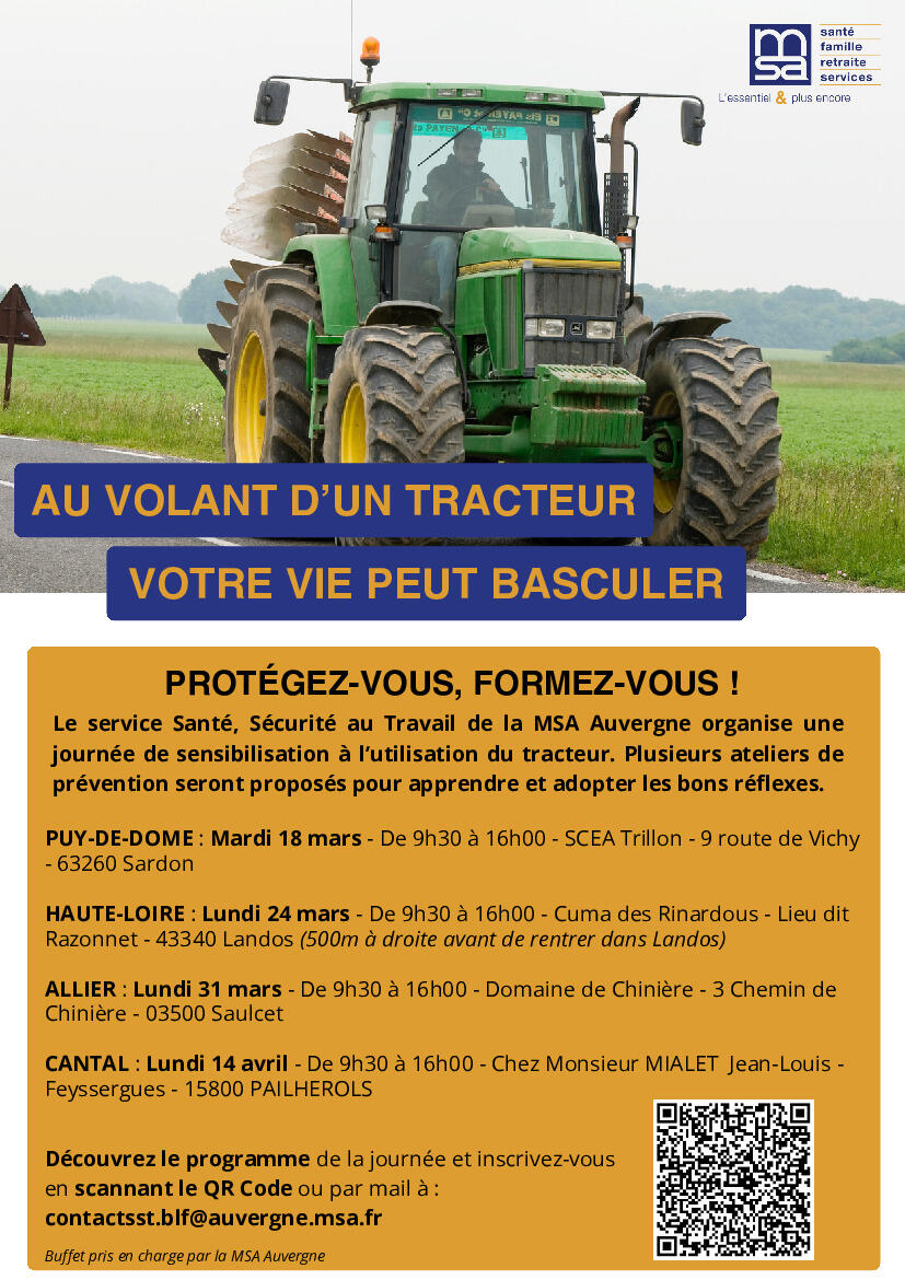 Le service Santé, Sécurité au Travail de la MSA Auvergne organise une journée de sensibilisation à l’utilisation du tracteur. RDV le 24 mars à Landos. Merci de vous inscrire via le lien indiqué sur le document ci joint.